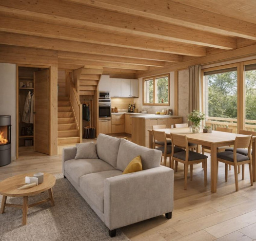Le chalet dispose d'un garage attenant avec un accès direct à l'habitation. La pièce de vie, ouverte sur l'extérieur, offre une belle luminosité naturelle. Une suite parentale au rez-de-jardin vient compléter ce niveau pour un confort optimal.