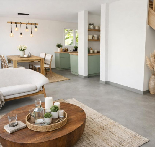 Au rez-de-chaussée, la maison propose une pièce de vie spacieuse et lumineuse, composée d'une cuisine ouverte sur le séjour et le salon, favorisant une atmosphère conviviale et chaleureuse. Des espaces annexes pratiques, tels qu'un cellier attenant, complètent ce niveau et facilitent l'organisation du quotidien.